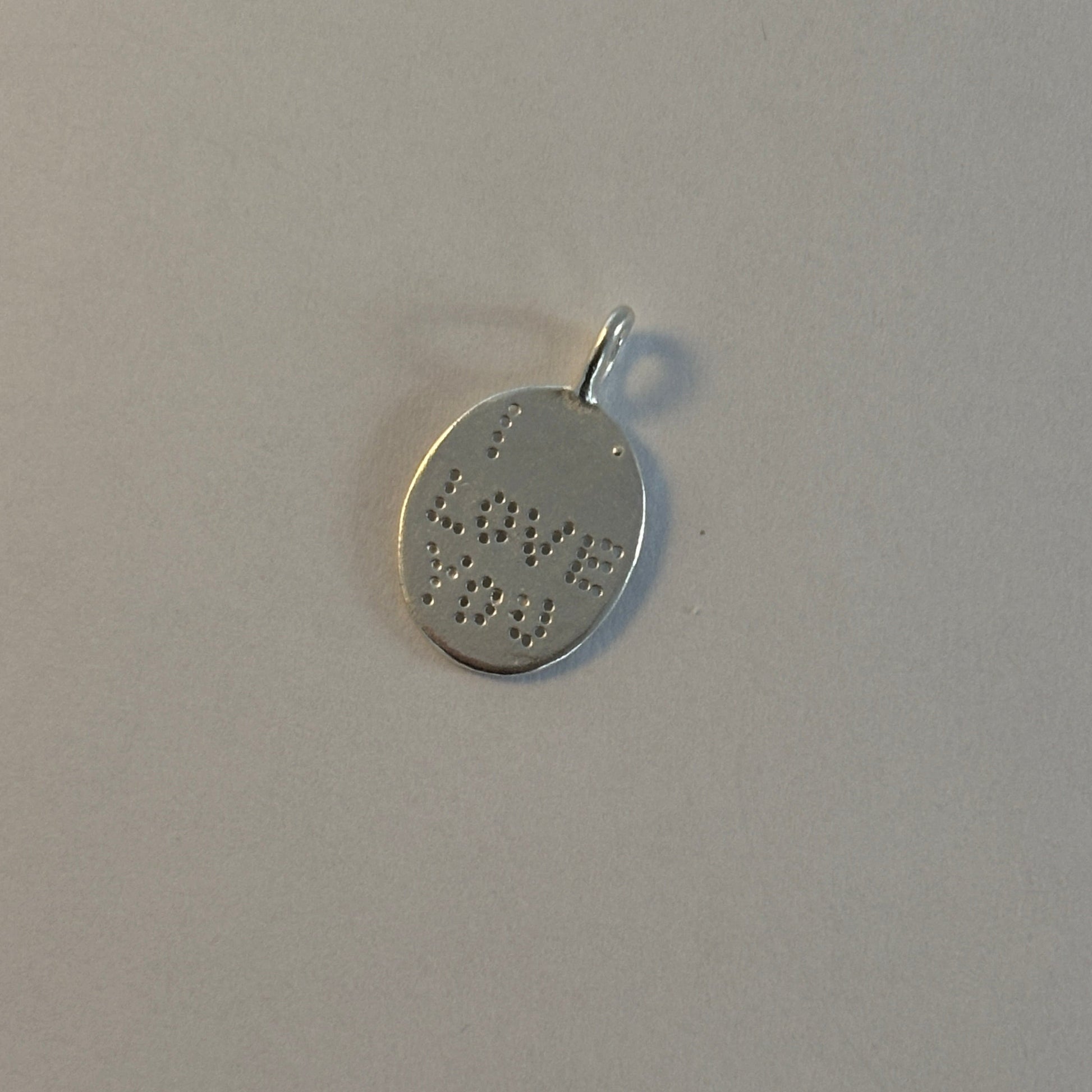 The I Love You Pendant is crafted from Sterling Silver and features drilled lettering.