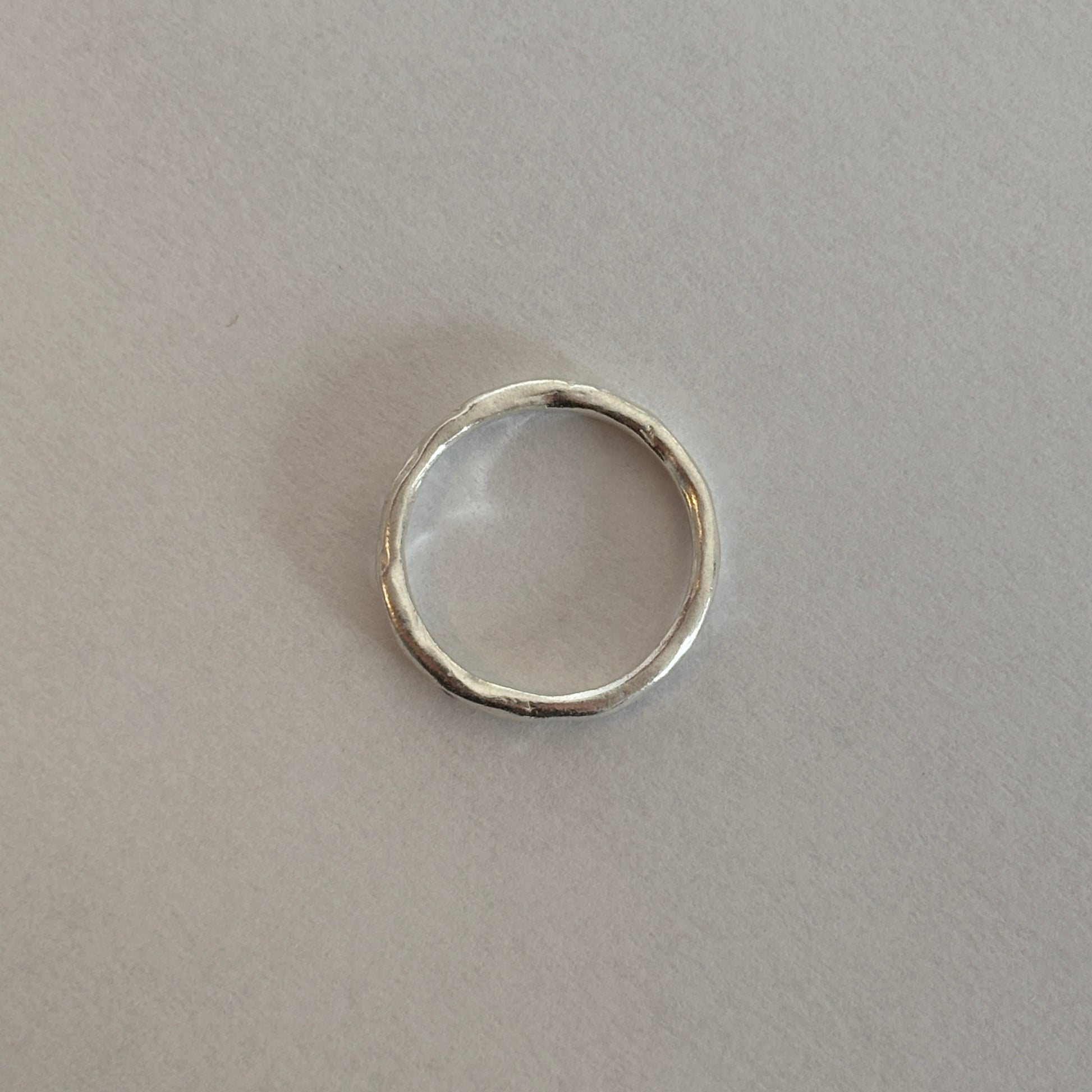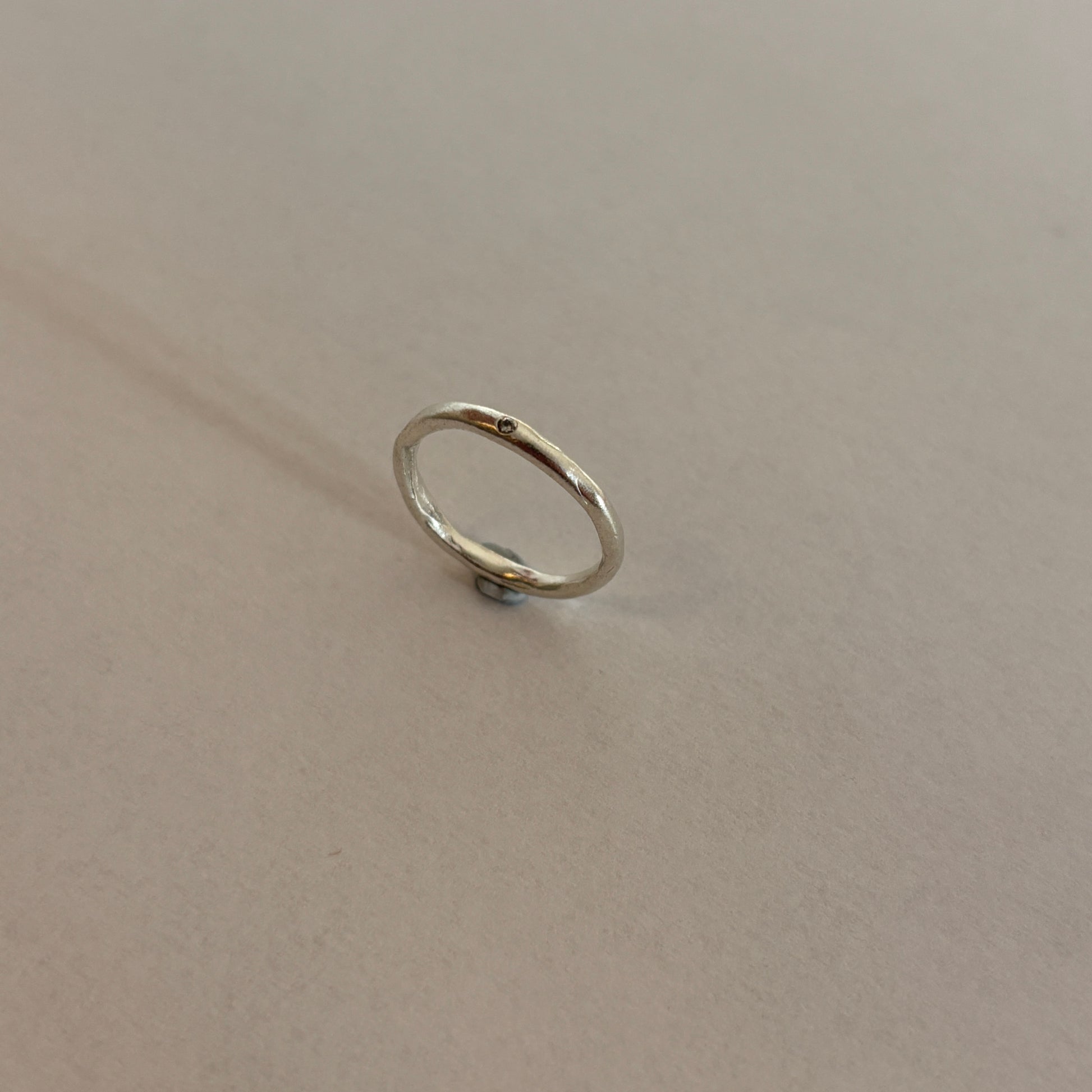 The Silver Diamond ring is crafted from solid Sterling Silver and features a 1.5mm diamond set into a fine textured band, with softly uneven details.